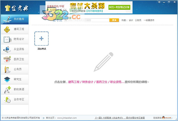 包括建筑工程類、財務會計類,從業(yè)資格證類,國家公務員等數(shù)以百計學科,客戶都能在金考典官方網(wǎng)站下載免費試用,完全免費更新,手機軟件根據(jù)流行電腦殺毒軟件權威認證,可以信賴
