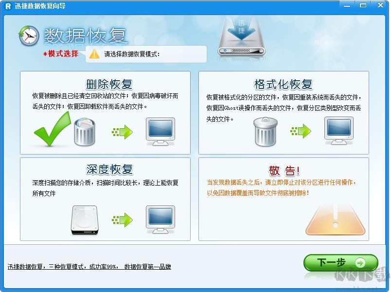 迅捷數(shù)據(jù)恢復(fù)軟件軟件界面功能:(選擇對應(yīng)的恢復(fù)模式有助于更高效的恢復(fù)和提升成功率)