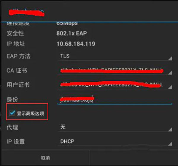 4、打開android設(shè)備的“設(shè)置”->“WLAN”,找到你要連接的網(wǎng)絡(luò),在上面長按,然后選擇“修改網(wǎng)絡(luò)”,彈出網(wǎng)絡(luò)設(shè)置對話框,然后勾選“顯示高級選項”。