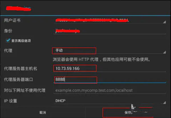 5、在“代理”后面的輸入框選擇“手動”,在“代理服務(wù)器主機名”后面的輸入框輸入電腦的ip地址,在“代理服務(wù)器端口”后面的輸入框輸入8888,然后點擊“保存”按鈕。