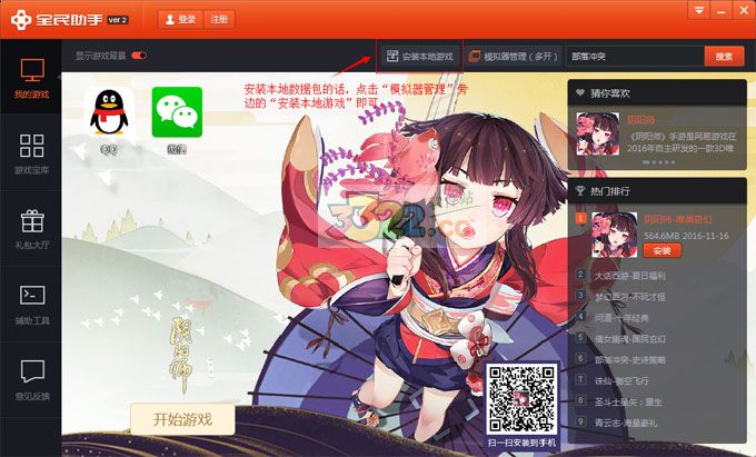 啟動模擬器之后,在“我的游戲”界面的上方,點擊“安裝本地游戲”進行安裝;或者可以將安裝包直接拖入模擬器進行安裝。