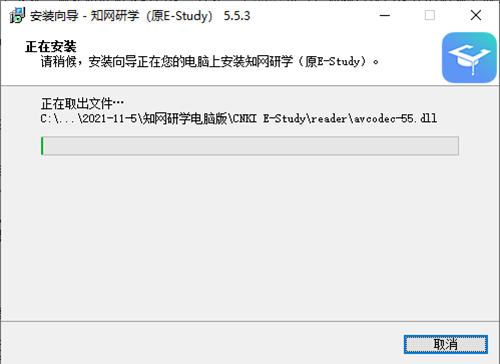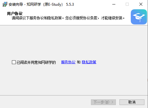 2、解壓之后可以得到“E-Study_v5.5.3.exe”,點擊運行開始安裝,接受用戶協(xié)議后,點擊下一步;