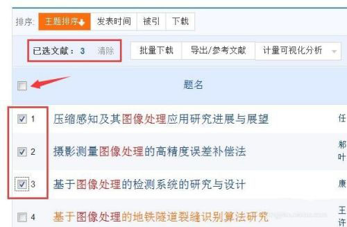 2、清除之前已選文獻后,單擊文獻之前“復(fù)選框”選擇文獻,如圖已選中3個文獻,還可以單擊箭頭所指“復(fù)選框”選中該頁全部文獻。