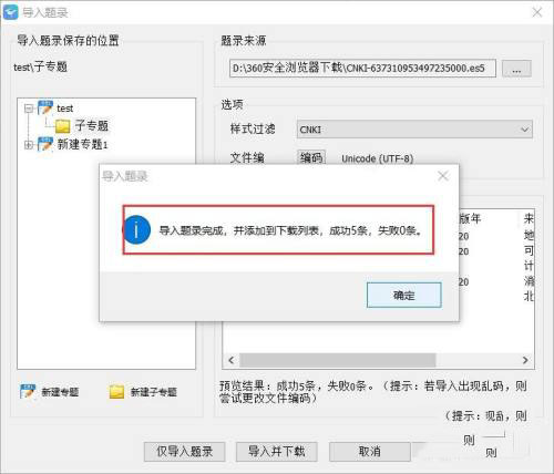 5、安裝完軟件后,打開下載的題錄文件,會彈出“導(dǎo)入題錄”窗口,新建一個文件夾儲存或者使用已有文獻夾,可以看到內(nèi)容是之前選中的5篇文獻,接著單擊“僅導(dǎo)入題錄”。