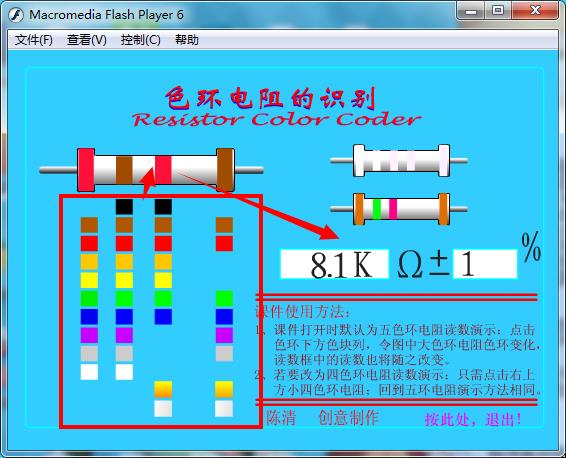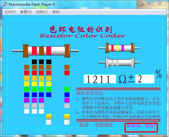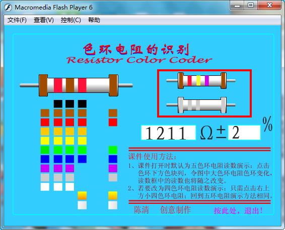 3、同時若要改為四色環(huán)電阻讀數(shù)演示,只需點(diǎn)擊右上方小四色環(huán)電阻,回到五環(huán)電阻演示方法亦相同。