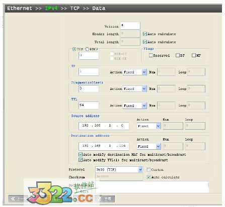 步驟六:點(diǎn)擊下一步,出現(xiàn)Ipv4頭部頁面,輸入源IP(為了偽裝隨便寫一個(gè)IP地址)和目的IP(目標(biāo)機(jī)地址,這里同學(xué)們可填寫虛擬機(jī)的IP),protocol選擇“0x06 (TCP)”。
