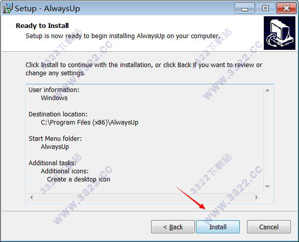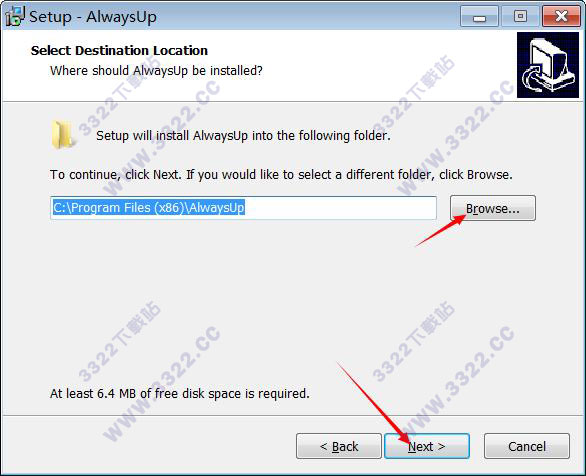 3、選擇程序的安裝路徑,默認(rèn)路徑為C:\Program Files (x86)\AlwaysUp,可點(diǎn)擊browse更換安裝路徑,或直接默認(rèn),請(qǐng)確保所選擇的硬盤(pán)滿(mǎn)足其安裝要求