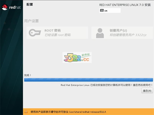 6、設(shè)置root密碼和用戶,root密碼必須創(chuàng)建,用戶可以不創(chuàng)建,必須完成root密碼的創(chuàng)建才會繼續(xù)安裝,否則無法安裝我們的系統(tǒng),特別提醒redhat linux 7.0的root密碼如果小于8位需要按兩次完成才能夠確定。