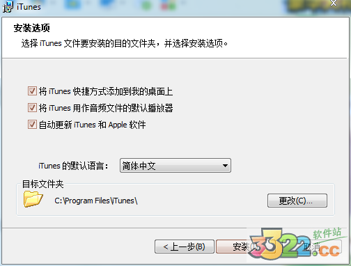 2、選擇好iTunes安裝路徑,及勾選好安裝選項(xiàng),點(diǎn)擊“安裝”(小編提醒:安裝的路徑不要選擇電腦系統(tǒng)盤,這樣容易引起電腦的運(yùn)行速度過慢,還有勾選的選項(xiàng)最好不要去動,直接默認(rèn)就行)