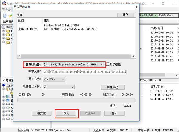 3、選擇剛剛插入電腦的優(yōu)盤,并點擊“寫入”,即會開始制作系統(tǒng)優(yōu)盤,此過程會將優(yōu)盤自動格式化!