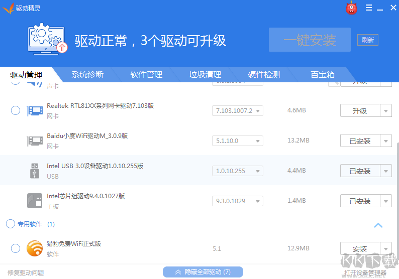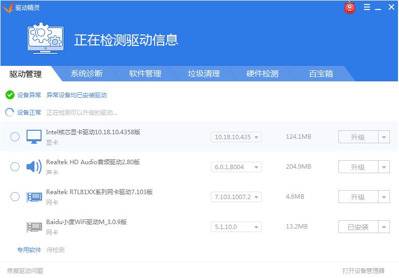 2、在驅(qū)動管理中,檢測出可升級的驅(qū)動之后點擊升級或安裝(如電腦正常,驅(qū)動不升級也沒事)