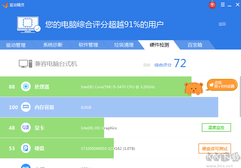 4、硬件檢測功能,一鍵檢測所有電腦硬件的情況并進行排名,很直觀了解自己的硬件情況。