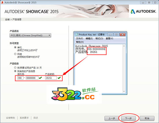 5、勾選“單機(jī)”并勾選“我有我的產(chǎn)品信息”并輸入序列號(hào)“0666666666”和產(chǎn)品密鑰“262G1”,并點(diǎn)擊下一步