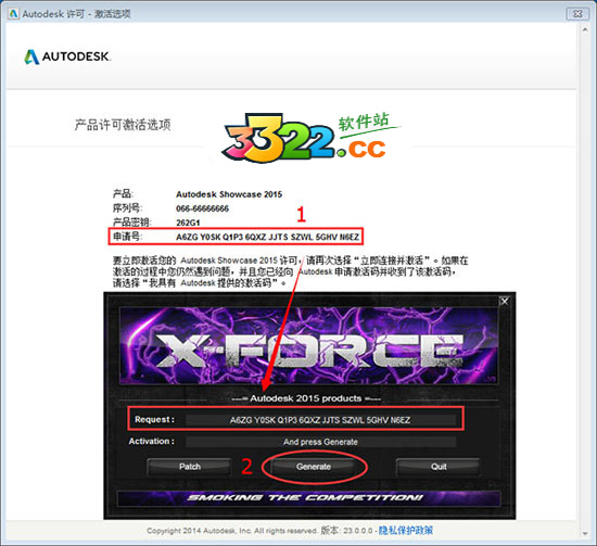 3、將程序中的請(qǐng)求碼復(fù)制到注冊(cè)機(jī)的Request欄中,并點(diǎn)擊“cenerate”得到注冊(cè)碼,鼠標(biāo)右鍵將其復(fù)制