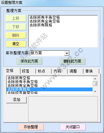 點擊“空格”、“段落”、“標點”、“內(nèi)碼”、“調(diào)整”、“替換”后,就會顯示有關的整理或替換項目,用戶可以增刪。默認顯示的是有關“空格”的整理項目。