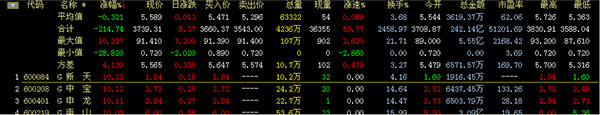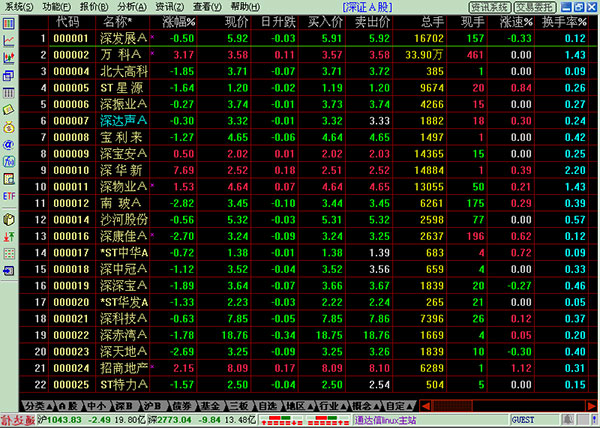 敲數(shù)字81、82、83、84、85、86、87,可分別調(diào)出上海A、B股,深圳A、B股,滬債、深債,深滬A股的綜合排名。系統(tǒng)用9個(gè)排成方陣的小窗列出所選市場(chǎng)的股票的漲幅、跌幅、振幅、5分鐘漲幅、5分鐘跌幅、量比、委比、成交金額排名。