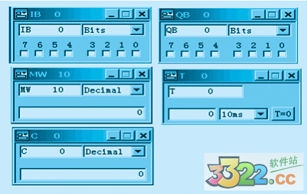 用菜單命令I(lǐng)nsert>input variable監(jiān)控輸入變量;Insert>output variable監(jiān)控輸出變量,Insert>memory variable監(jiān)控內(nèi)部變量;Insert>timer variable監(jiān)控定時(shí)器變量;Insert>counter variable監(jiān)控計(jì)數(shù)器變量。圖示表示上述變量表。這些變量可以用二進(jìn)制、十進(jìn)制、十六進(jìn)制來(lái)訪問(wèn),但是必須注意輸出變量QB一般不強(qiáng)制修改。