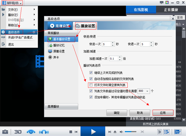 請您進入主菜單——高級選項——播放設(shè)置——基本播放設(shè)置中,查看您是否勾選”打開文件時清空原有列表”