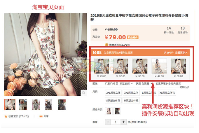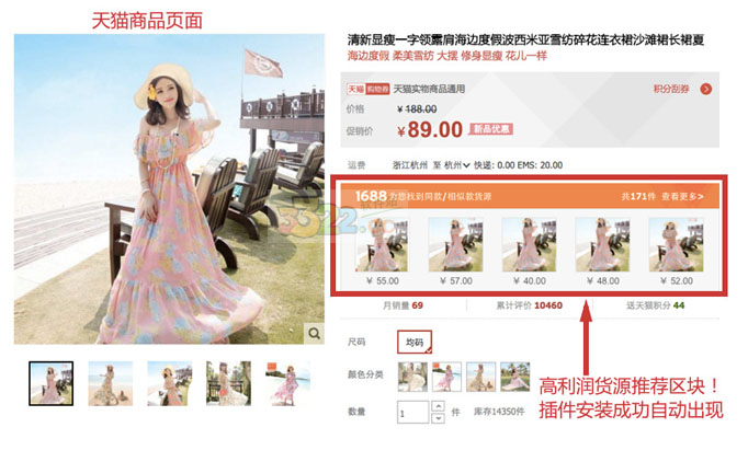 1、安裝好后,當(dāng)你瀏覽近4億的淘寶天貓的寶貝時,會自動出現(xiàn)1688的同款,相似款貨源推薦!