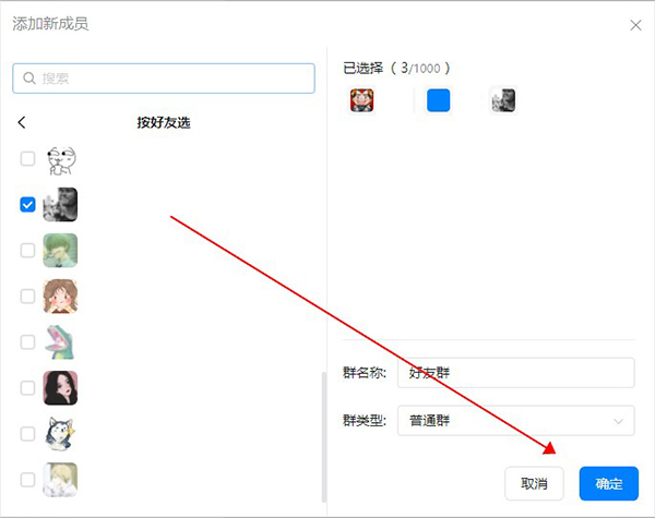 2、接著就會彈出一個創(chuàng)建群聊的窗口,如下圖所示,輸入群聊名稱,選擇群類型(一般就是普通群)。在左側(cè)的好友列表中勾選即可。