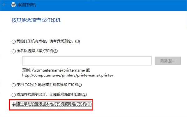 2、選擇“通過手動(dòng)設(shè)置添加本地打印機(jī)或網(wǎng)絡(luò)打印機(jī)”,并點(diǎn)擊“下一步”(Win 7系統(tǒng)點(diǎn)“添加本地打印機(jī)”)