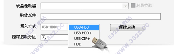 4、選擇后彈出如下窗口,依次按圖示選擇:USB-HDD+ v2、高端隱藏 、U盤(插入多個U盤時需選擇)