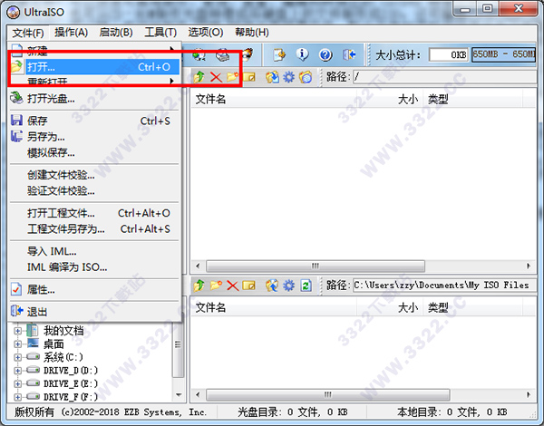 1、首先先啟動軟件,然后在”文件---打開“中打開下載好的系統(tǒng)ISO鏡像文件