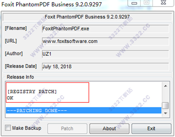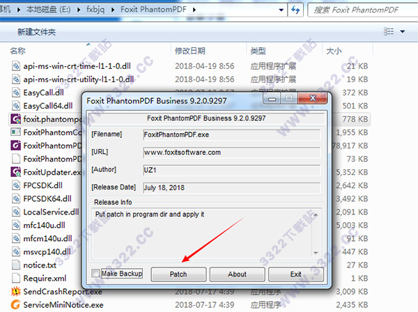 2、將[foxit.phantompdf.business.9.2.0.9297-patch UZ1.exe]拷貝到運行福昕鳳騰安裝目錄下運行,點擊[Patch]按鈕