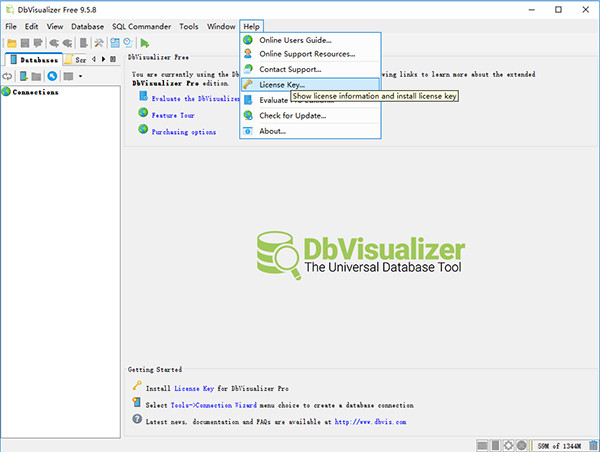 5、打開(kāi)dbvisualizer,選擇Help=》License Key ,然后下載導(dǎo)入dbvis.license文件