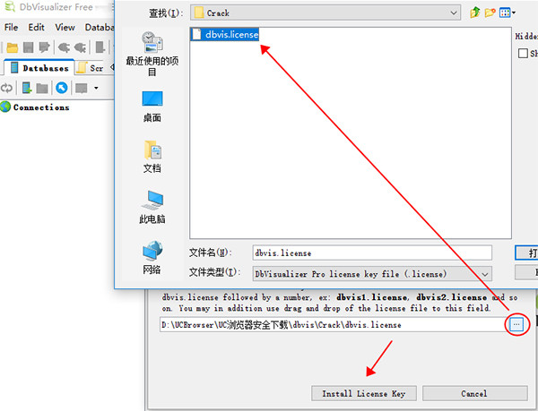 6、在證書(shū)窗口中選擇“導(dǎo)入”圖標(biāo),彈出的文件資源管理窗口中找到“dbvis.license”,雙擊導(dǎo)入即可,導(dǎo)入完成后點(diǎn)擊“Install License Key”進(jìn)行破解