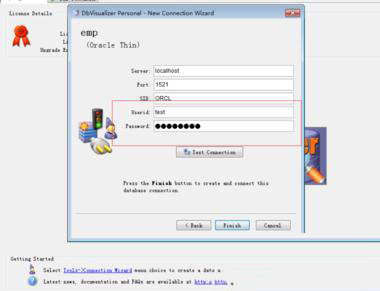 5、在轉(zhuǎn)入的界面中填寫(xiě)要連接數(shù)據(jù)庫(kù)的userid和password,然后點(diǎn)擊finish