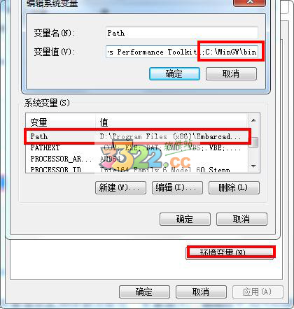 7、點(diǎn)擊環(huán)境變量,找到系統(tǒng)變量的path變量,在最后加上“;C:\MinGW\bin”。