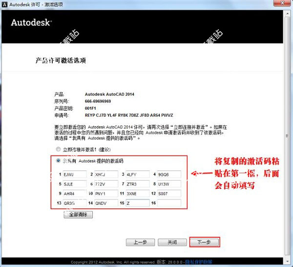 9、激活A(yù)utoCAD2014,粘貼激活碼的時候,只需要選中第一個輸入框,然后粘貼即可。所有的激活碼會自動填充