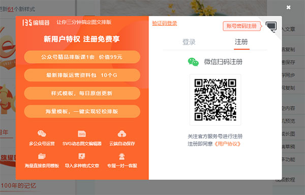 微信掃碼關(guān)注135平臺(tái)服務(wù)號(hào),即可快速完成注冊(cè),當(dāng)然,也可以用手機(jī)號(hào)、QQ、微信第三方賬號(hào)來(lái)注冊(cè):