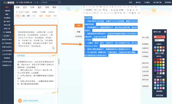 鼠標(biāo)選中編輯區(qū)域中的圖文,在左側(cè)的樣式欄中選擇一個(gè)樣式,點(diǎn)擊就可以完成秒刷排版