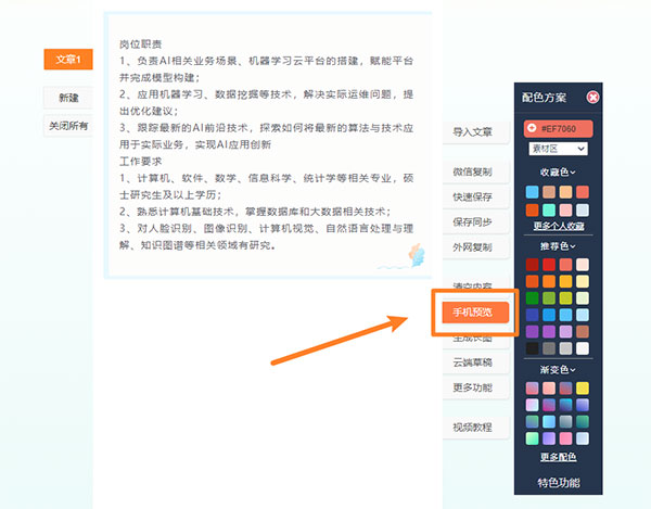 完成文章的排版后,可以使用【手機(jī)預(yù)覽】功能,掃碼查看排版在手機(jī)上的顯示效果