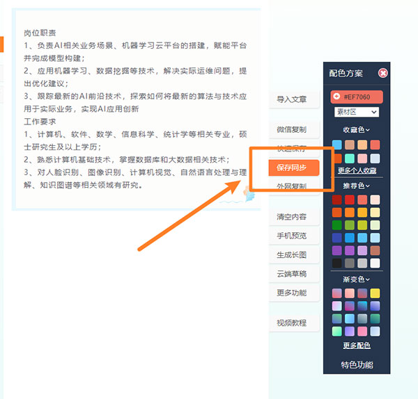 在135編輯器首頁(yè)右側(cè),點(diǎn)擊【保存同步】,即可保存已經(jīng)編輯排版好的文章。