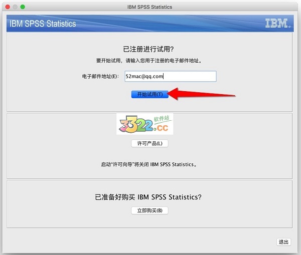6、現(xiàn)在打開軟件SPSS,如下圖,提示試用,我們在電子郵件地址欄里隨便輸入一個(gè)郵箱,點(diǎn)擊開始試用