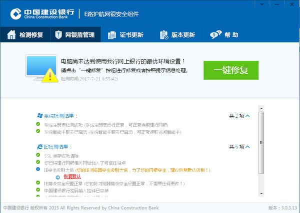 中國(guó)建設(shè)銀行E路護(hù)航網(wǎng)銀安全組件由建設(shè)銀行提供給網(wǎng)銀用戶的一款必須安裝的安全檢測(cè)工具,一鍵檢測(cè)網(wǎng)銀環(huán)境,網(wǎng)銀安全控件、密碼保護(hù)控件以及最新版的網(wǎng)銀盾管理工具,它可以快速解決網(wǎng)銀不能使用的問題,同時(shí)提供有效安全的交易環(huán)境防護(hù)。