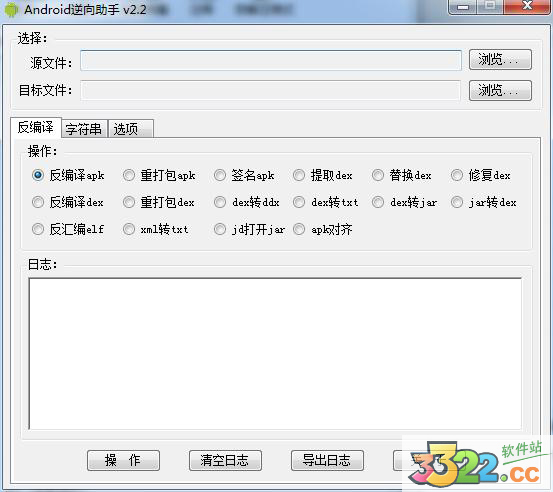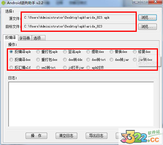 2、直接將apk文件拖放到源和目標(biāo)文件,再設(shè)置相應(yīng)的參數(shù),如反編譯apk;