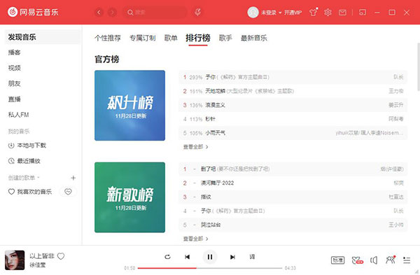 網(wǎng)易音樂為音樂庫所有音樂提供了320K的高質(zhì)量聽力,并可以根據(jù)互聯(lián)網(wǎng)情況自由選擇音色。在當(dāng)?shù)馗枨鷻谥?,網(wǎng)易音樂可以自動刷新當(dāng)?shù)匾纛l文件,在自己的音樂庫中匹配歌曲,免費使用當(dāng)?shù)馗枨蔀楦哔|(zhì)量的音樂。三端同一個電腦版本的發(fā)布代表了網(wǎng)易音樂進(jìn)一步完成視頻的云同步,PC、APP和網(wǎng)頁三個版本號,無論個人收集什么版本的音樂或建立歌曲列表,只需連接到互聯(lián)網(wǎng),就可以立即同步數(shù)據(jù)。