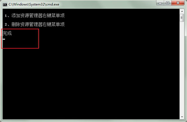 2、首先雙擊運(yùn)行"!)添刪右鍵菜單.bat"程序,輸入數(shù)字1,添加資源管理器,之后看到到完成;