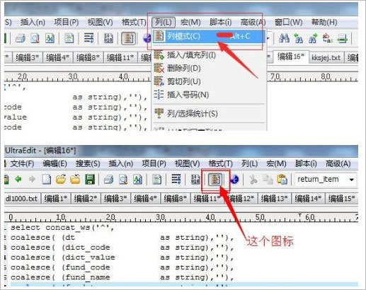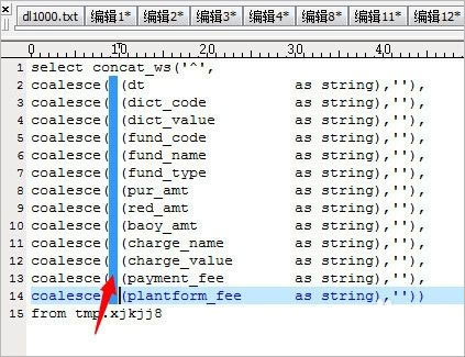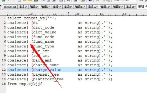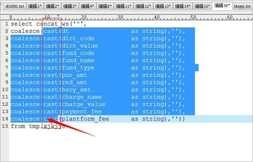這段sql放數(shù)據(jù)庫里肯定報(bào)錯(cuò),因?yàn)樯倭藗€(gè)cast關(guān)鍵字,那么怎么為這幾行同時(shí)加上cast這幾個(gè)字呢?我們就要切換到列模式
