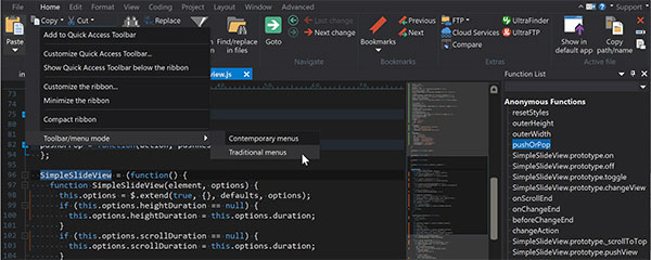 您工作的環(huán)境是個(gè)人的事情。借助UltraEdit的可深度定制的新菜單系統(tǒng),您可以享受完美的應(yīng)用程序內(nèi)菜單。我們?nèi)碌牟藛问鼓梢栽谕暾墓δ軈^(qū),緊湊的功能區(qū)和菜單/工具欄系統(tǒng)之間進(jìn)行切換,僅需按一下按鈕即可。