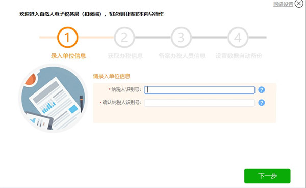在納稅人識別號,確認(rèn)納稅人識別號的位置輸入扣繳單位的納稅人識別號,已進(jìn)行過三證合一的單位則輸入統(tǒng)一社會信用代碼,點(diǎn)擊【下一步】,即可完成注冊的第一步。