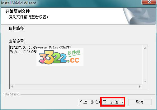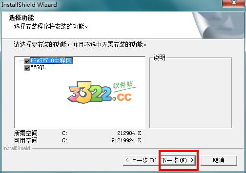 七、選擇安裝程序的安裝功能,包括主程序和Mysql,此外,并提醒用戶所需要的空間212904K,如果用戶硬盤不夠,請選擇其他硬盤進(jìn)行安裝,完成點(diǎn)擊“下一步”