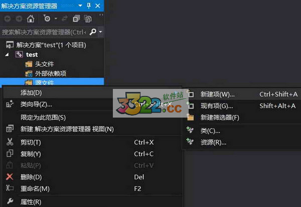 解決方案資源管理器 -> 源文件(右鍵)-> 添加 -> 新建項