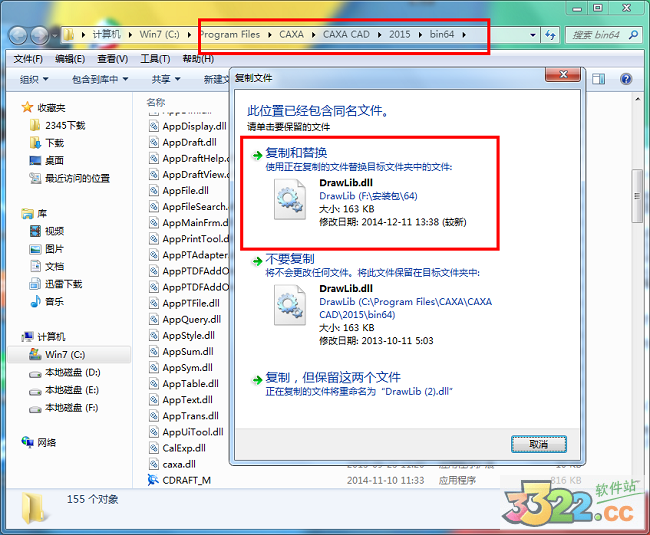1、這里用戶(hù)要根據(jù)自己的操作系統(tǒng)進(jìn)行破解文件的選擇,如果是64位的操作系統(tǒng),那么就選擇64文件夾內(nèi)部的破解文件,然后將破解文件DrawLib.dll鼠標(biāo)右鍵進(jìn)行復(fù)制