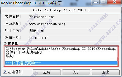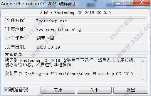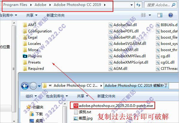 5、接下來開始破解,將photoshop cc 2019破解補(bǔ)丁文件“adobe.photoshop.cc.2019.20.0.0-patch.exe”拷貝到photoshop cc 2019安裝目錄下,軟件默認(rèn)安裝目錄【C:\Program Files\Adobe\Adobe Photoshop CC 2019】,如下圖所示:
