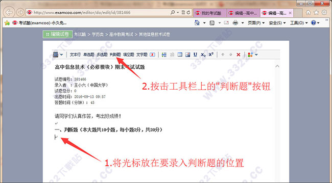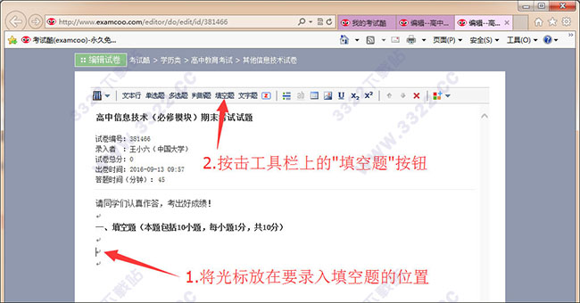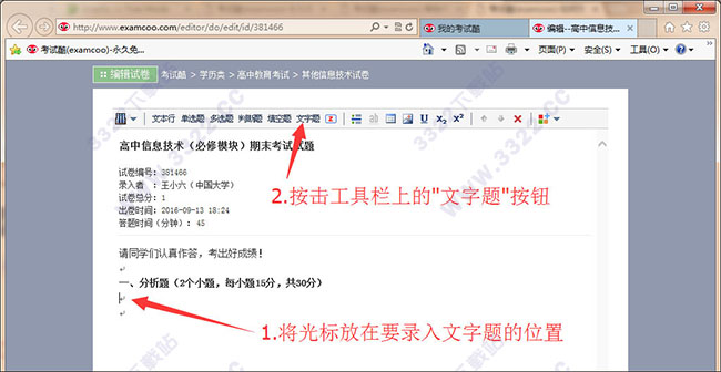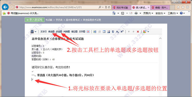5.如下圖箭頭處所示,將鼠標(biāo)光標(biāo)放在相應(yīng)的編輯區(qū)域,就可以錄入試卷的各個元素(試卷名稱、答題時間、文本行和試題等)。